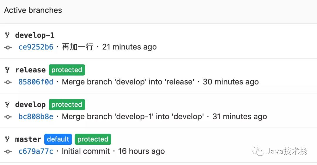 feature的开发分支不做具体的保护设置,即开发人员可以修改后,add,commit,push origin,这里不做详细讲解,push之后,可以在分支页面看到相应commit日志。如下。