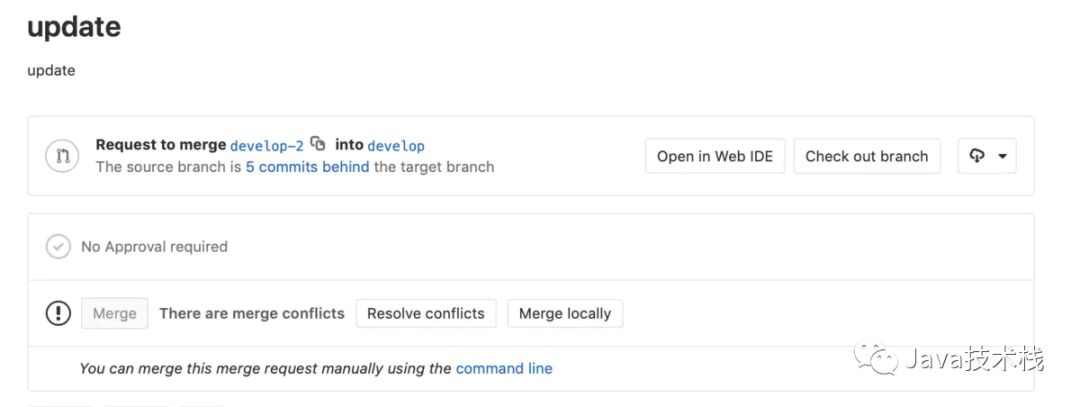 多个分支向一个分支合并代码等流程中,往往会形成版本冲突。此时,提交merge request后的页面如下: