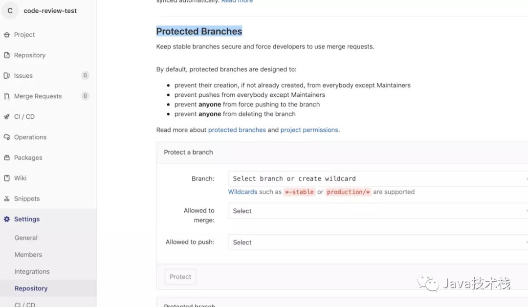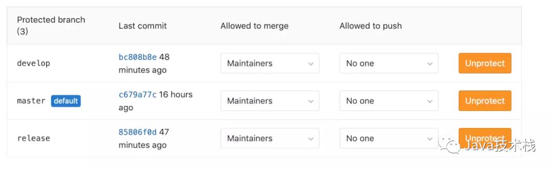 将master,develop,release三个分支设置成只允许maintainers merge,不允许任何人push,也即在杜绝了上文说的从本地merge,push到远端的情况