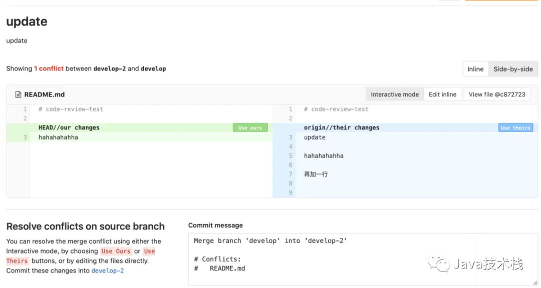 页面可以通过use ours指定使用当前分支(发起merge request的源分支)代码或者use theirs来指定使用目标分支代码。或者点击 edit inline直接通过编辑页面编辑(更通用)。