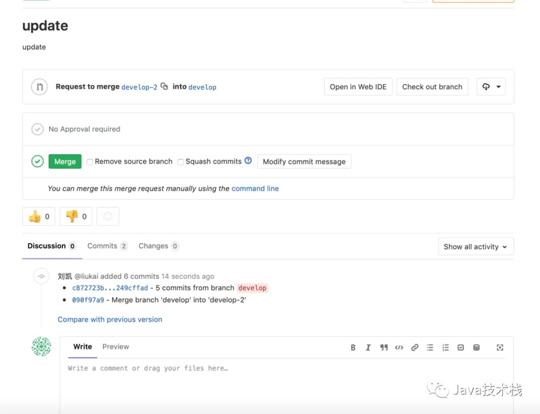 3)reviewer 通过代码review,没有问题,可以点击merge,完成合并操作。如果有问题,可以发起讨论,或者直接关闭merge请求。