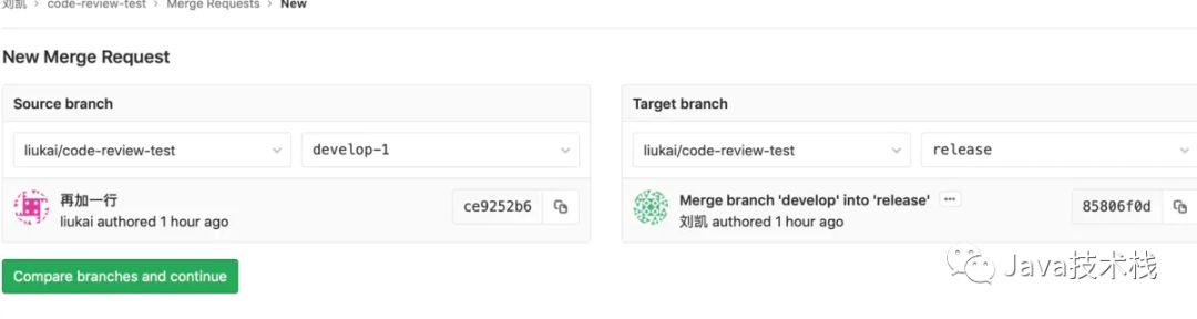 选择source branch 和Target branch,这里我选择的是develop-1到release(假设到了预上线阶段),点击compare branches and continue。