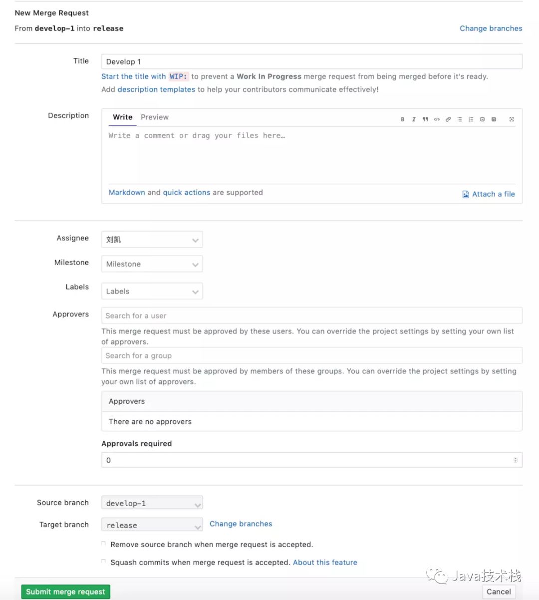 2)开发分支开发完成后push到远端,通过页面提交merge request,指定reviewer和审批人,一般指定reviewer即可。