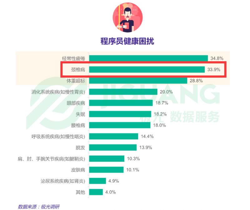 而久坐缺少运动,无疑会增加肥胖的几率。报告显示,在程序员的健康困扰中,颈椎病和体重超标位列前三。
