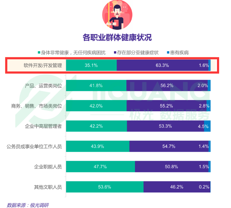 相比其他职业群体,程序员的身体健康状况并不乐观。报告显示:63.3%的受访程序员目前存在部分亚健康症状,高居各行业之首。