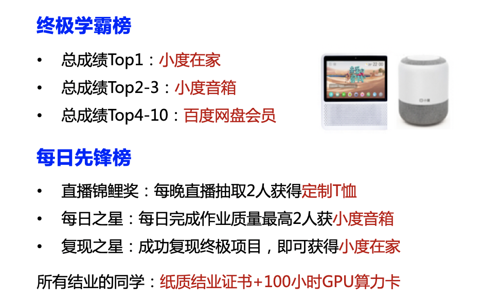 打卡营采用全程的直播+答疑+比赛的学习模式,7天时间里每日直播打卡学习、配合实战PK、全程社群答疑、百度飞桨认证结业证书等,让你的学习有见证有收获,求职有帮助!