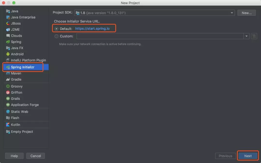 选择Spring Initializr,Initializr默认选择Default,点击Next