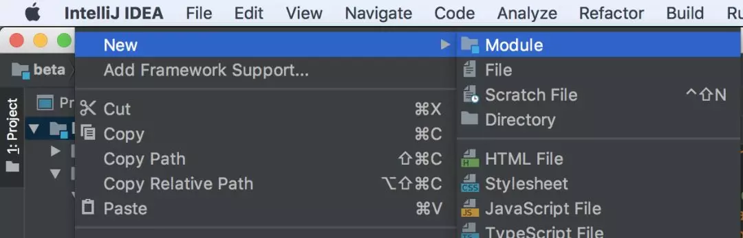 选择项目根目录beta右键呼出菜单,选择New -> Module