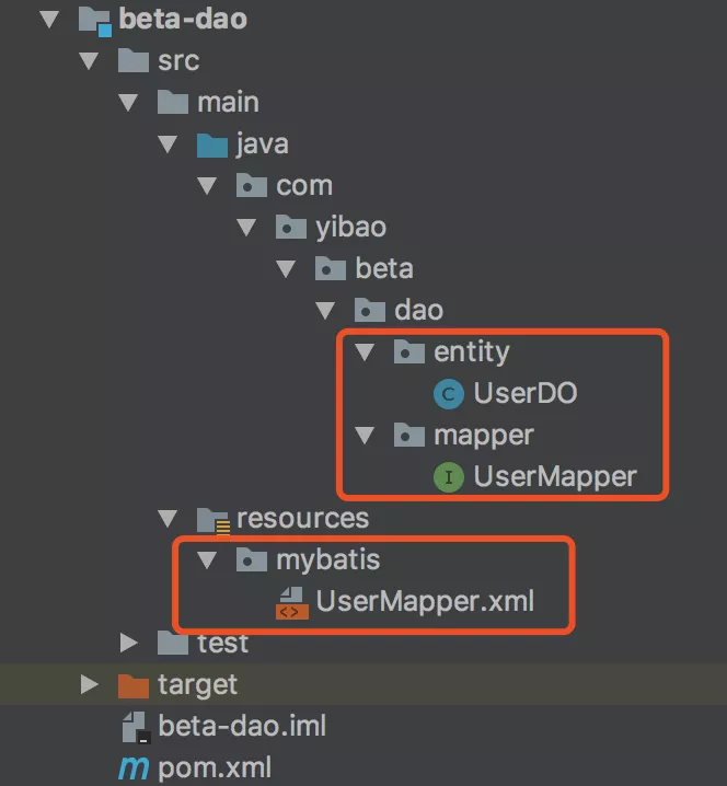 在beta-dao层创建com.yibao.beta.dao包,通过mybatis-genertaor工具生成dao层相关文件(DO、Mapper、xml),存放目录如下