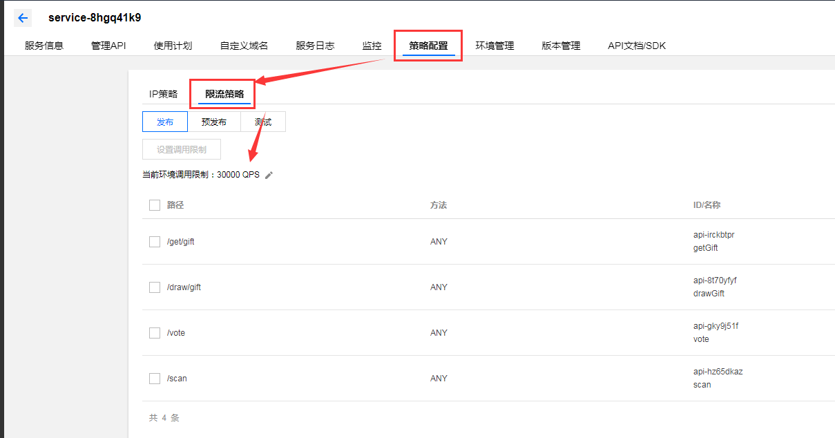 云 API 网关当前针对于这两种场景的限流场景均有限流策略,前者在 API 网关叫限流,可以从 API 维度、API 组维度以及用户维度(需要配合鉴权)对请求进行 QPS 限流;后者对应云 API 网关配额概念,该功能当前主要提供给云市场使用,用于精确计算调用次数。