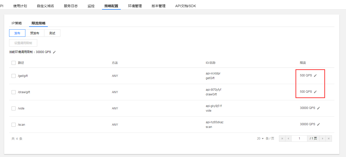 - 针对次要业务,使用 API 限流功能,对次要接口进行限流。故决赛当晚,对抽奖和兑奖 API 设置较低的 API 限流,保障投票等业务的资源不被抢占。