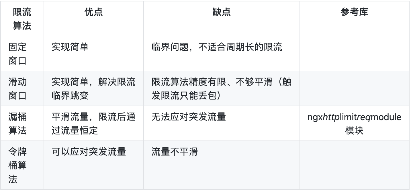 限流算法分为单机限流和全局限流,对于业界常见的单机限流的算法对比如下: