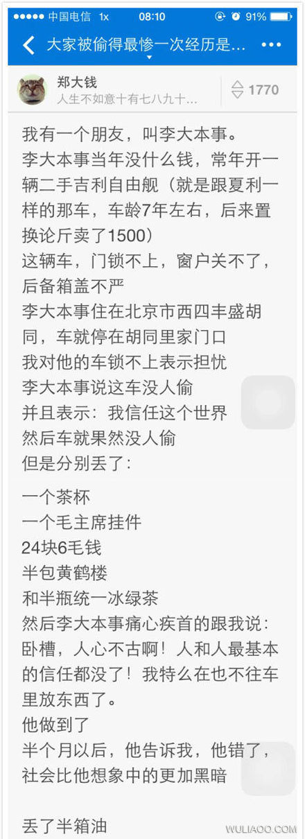“贼也是有道德底线的,没偷走你一箱油。”