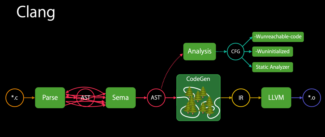 上图是传统的基于LLVM的编译器流程,比如C、C++以及Objective-C。代码分析主要是基于CFG(AST级别),CFG全称Control Flow Graph(函数流程控制图),是在clang这一层,但是这有很多缺点。