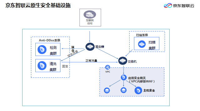 结合企业安全体系结构和京东智联云云原生的安全功能,可以看到基于云原生功能和安全产品,可以构建从基础设施到应用安全的全方位多层次安全防护体系,为企业数字化转型护航。