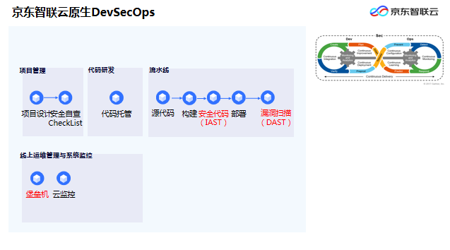 京东智联云推出一系列基于云的原生安全能力及产品,第一,在安全基础设施层,京东智联云用户可以使用 Anti-DDoS 系统,对所有流入京东智联云机房流量做统一的流量清洗;第二,京东智联云提供原生全链路加密,在端上可以使用 KMS、SDK 与 KMS 交互,进行数据加密;第三,京东智联云原生 DevSecOps 服务提供项目管理、代码托管、流水线几大功能,且在项目管理时加入 Sec 流程,在项目设计过程中提供安全自查 CheckList,以规避安全设计缺陷;第四,体用统一的安全中心对所有的安全风险作统一管控和处理。