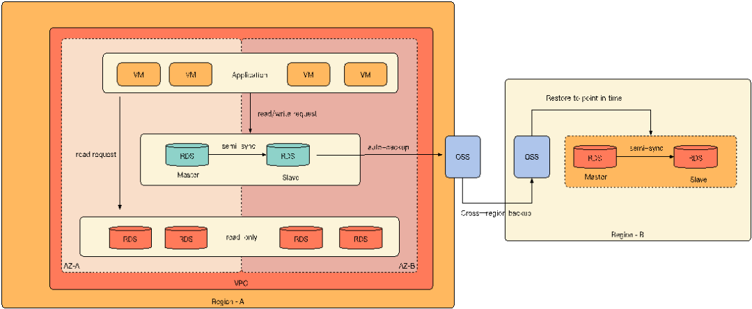 另外,在跨地域容灾方面,通过将云数据库 RDS 实例备份文件同步到不同 Region 的地域,RDS 可实现跨地域容灾,开启跨地域备份服务,不会对原云数据库 RDS 实例使用性能造成任何影响。