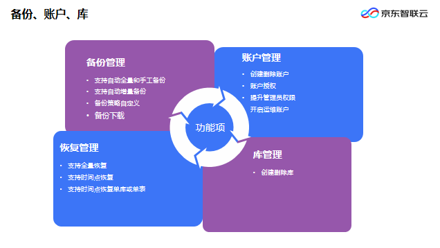 京东智联云云数据库的产品,目前支持 MySQL、Percona 和 MariaDB 等,实例管理有生命周期管理、只读管理、高可用管理,以及升配降配、实例重启等其他运维,备份管理、帐户管理、恢复管理、库管理。