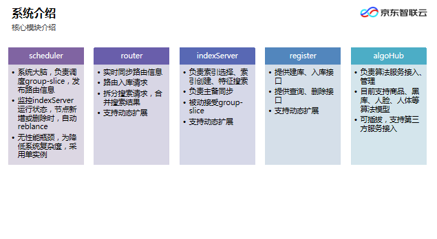 为应对上述挑战,京东智联云在业务中积累出一个通用化、高可用、高性能、高并发、可插拔、自动化的图搜平台,希望支持亿级底库、海量并发、秒级返回,支持动态入库、实时可查,支持第三方算法库的接入,对外赋能。