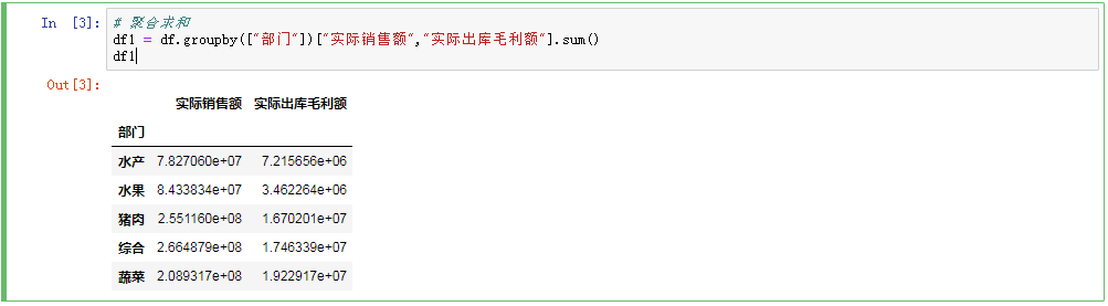 df1 = df.groupby(["部门"])["实际销售额","实际出库毛利额"].sum()