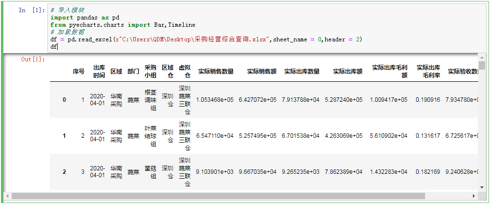 df = pd.read_excel(r"C:\Users\QDM\Desktop\采购经营综合查询.xlsx",sheet_name = 0,header = 2)