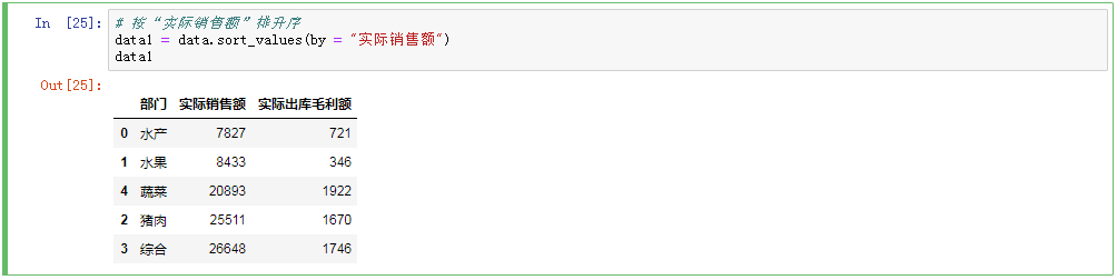 # 构建一个新的变量data1,用来接收按“实际销售额”排完升序之后的新变量