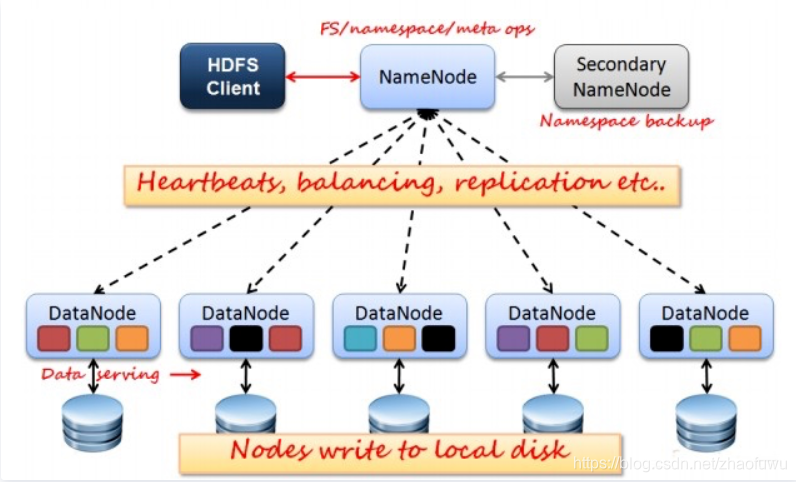 NameNode作为Master服务,它负责管理文件系统的命名空间和处理客户端对文件的访问请求。NameNode保存了文件的元数据信息(文件名,Black数量,Black所在位置等)。NameNode同时会接受DataNode的心跳信息。