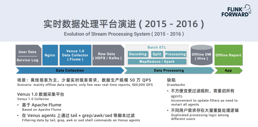Venus 1.0数据采集平台:基于Apache Flume;在Venus agents上通过tail+grep/awk/sed等脚本过滤;