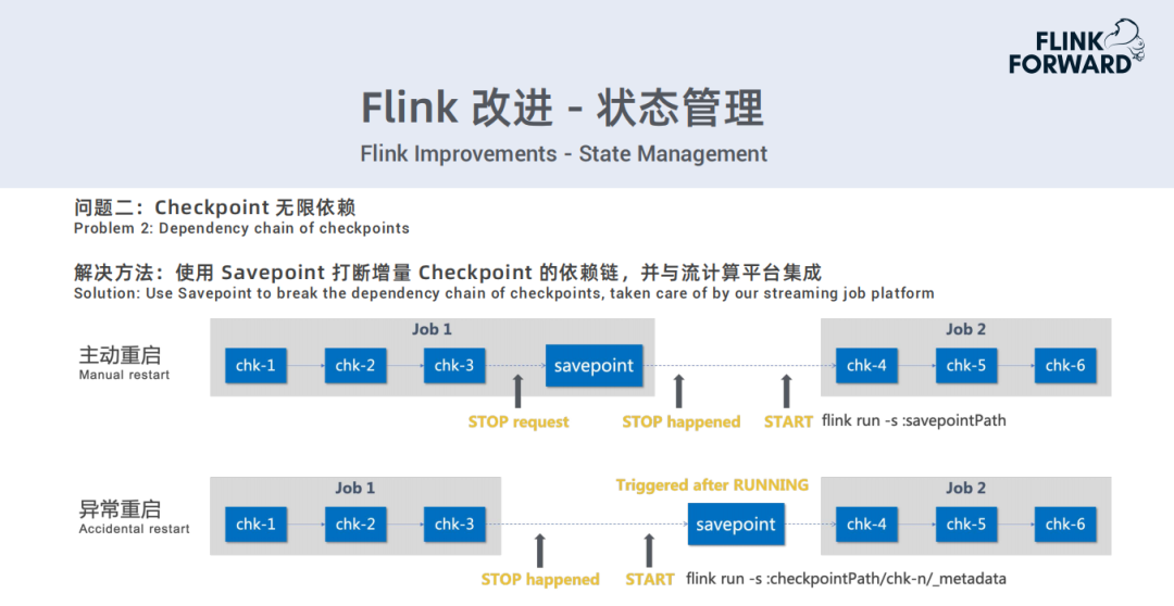第二种是发生异常重启时,来不及做Savepoint。那么会在Checkpoint启动起来,一旦job进入到running状态以后,立即做一次Savepoint,解决依赖问题。