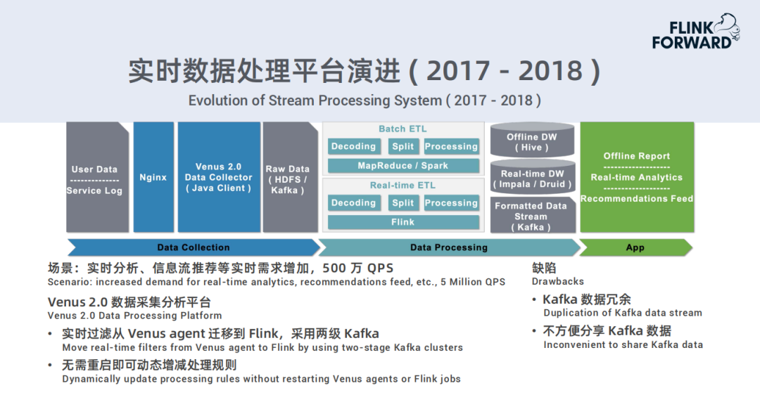 Venus 2.0数据采集分析平台:实时过滤从Venus agent迁移到Flink,采用两级Kafka;无需重启即可动态增减处理规则
