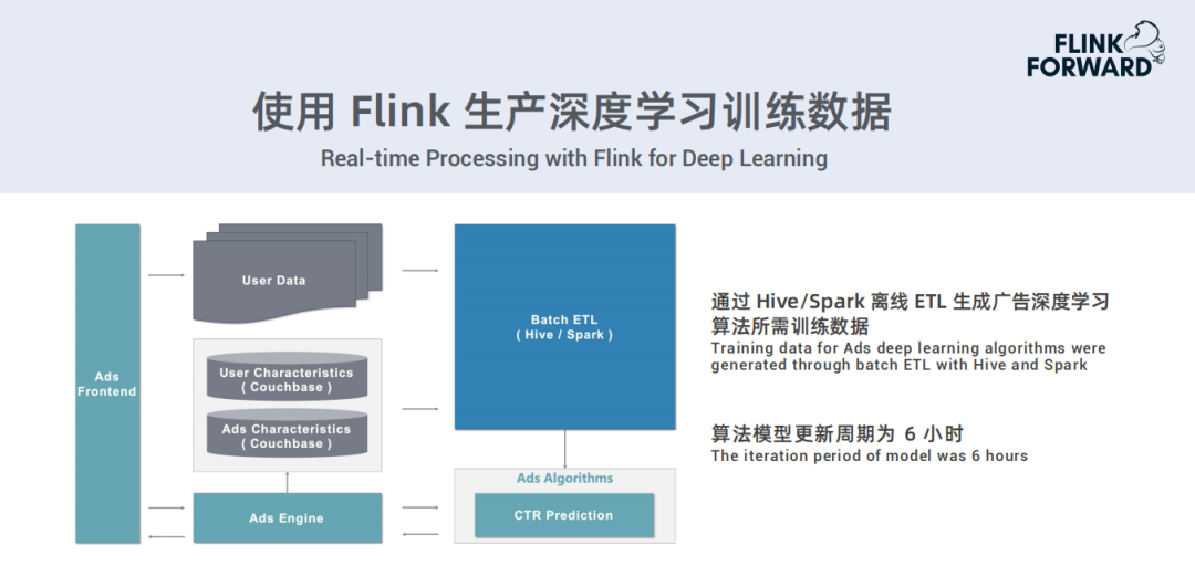 上图是一个广告推荐相关的例子,这是以前的一个架构,通过Hive/Spark离线ETL生成广告深度学习算法所需要的训练数据,算法模型更新周期为6小时。