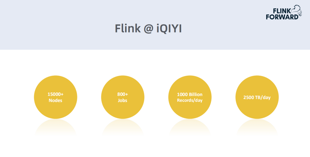 这是Flink在爱奇艺的一些使用情况,目前的节点规模大约15000多台,总的作业规模有800多个,每天的数据流的生产量大概在万亿级别,约2500TB左右。注:本数据仅代表嘉宾分享时的数据。
