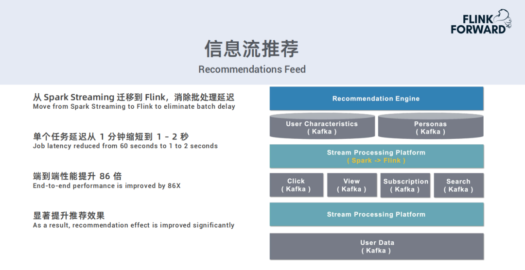 我们从Spark Streaming迁移到Flink,消除了批处理延迟。目前单个任务延迟从1分钟缩短到1-2秒,端到端性能提升86倍,并且显著提升了推荐效果。