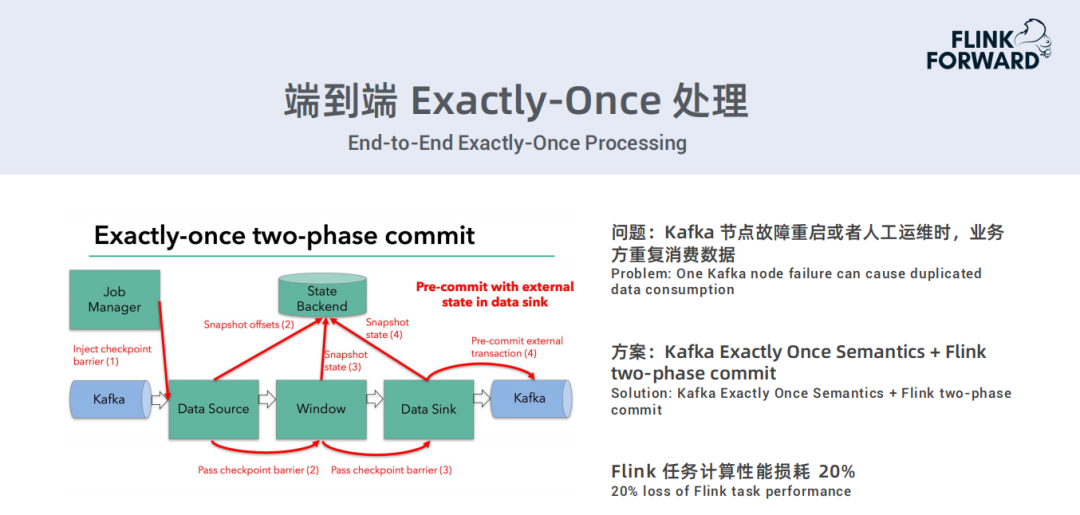 由于目前存在一个问题:Kafka节点故障重启或人工运维时,业务方重复消费数据。因此最近正在研究端到端Exactly-Once处理的一个方案:Kafka Exactly-Once Semantics + Flink two-phase commit.