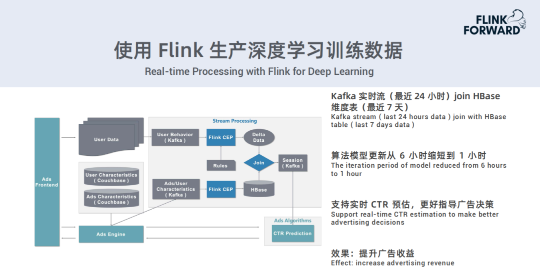 从2018年初开始,对框架做了实时的一个改造。实时过来的用户行为数据会实时投递到Kafka里,通过Flink处理完以后,生成一些新的Delta数据;过去7天分析的广告特征、用户特征投到Kafka,通过Flink处理完以后,存到HBase里。Kafka实时流(最近24小时)和HBase维度表(最近7天)这两部分数据Join之后生成一个Session流,再给算法预测使用。