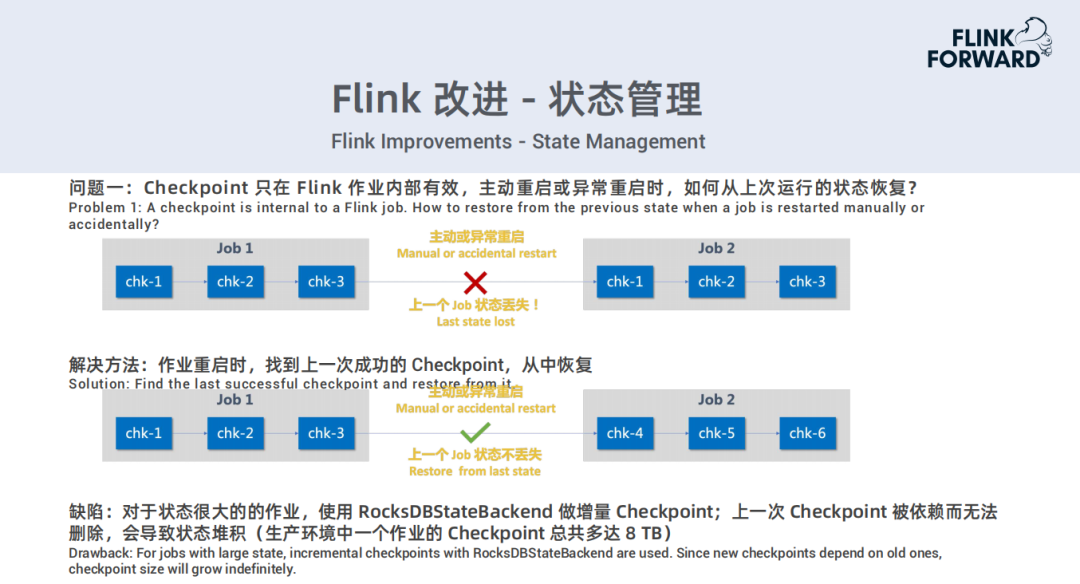 问题一:长时间运行Flink job,会因为各种原因导致它重启。Checkpoint只在Flink作业内部有效,一旦主动重启或异常重启时,上一个job的状态会全部丢失。