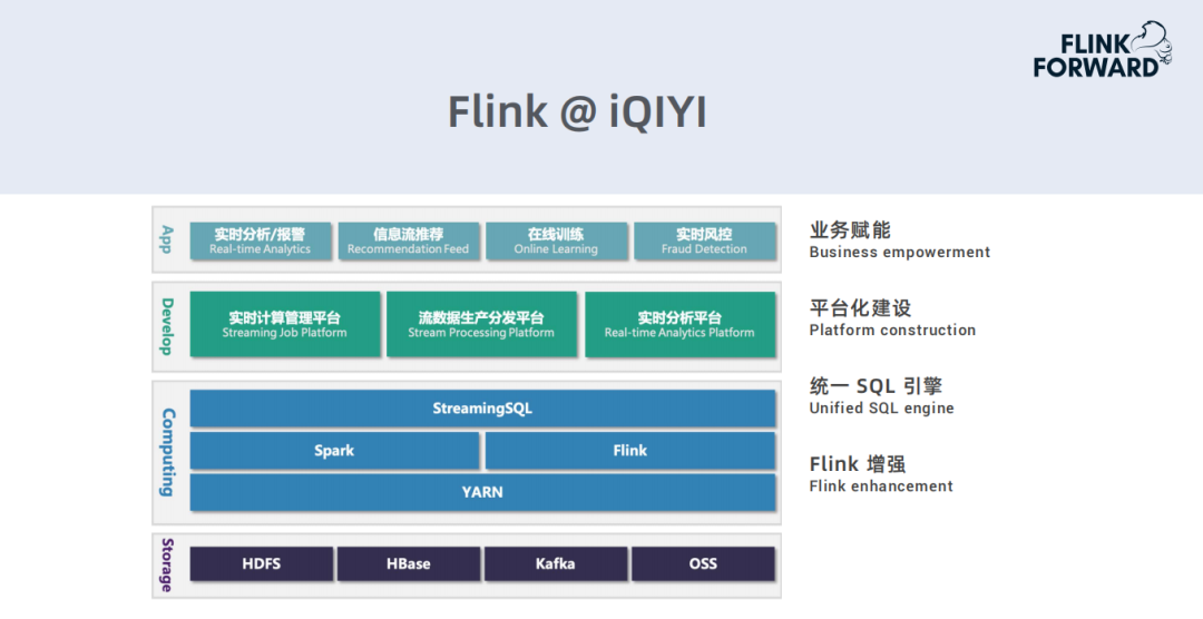 下面是目前爱奇艺基于Spark,Flink打造的实时计算平台框架: