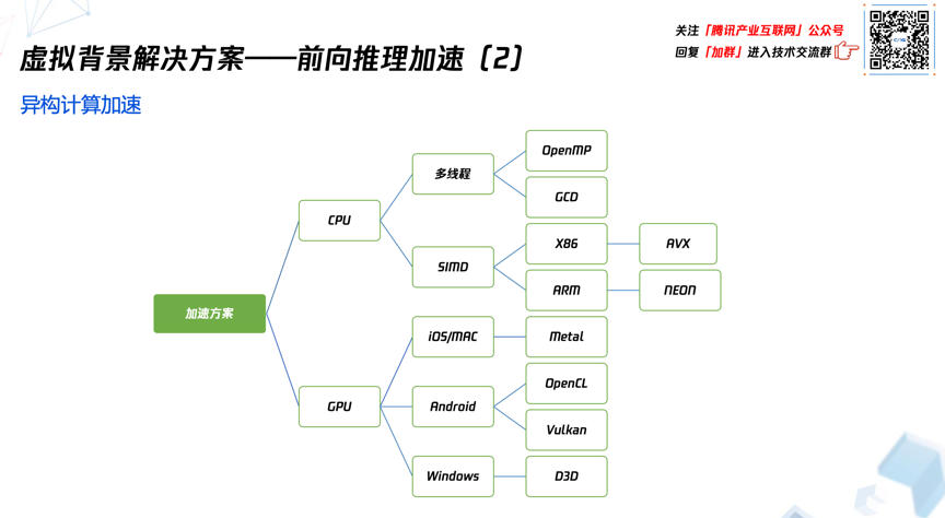 下面列了一些目前腾讯会议前向推理引擎支持的加速方案,由于不同的硬件或者处理器、设计理念不同,应用场景也不同,因此不同的方法在不同的处理器上会有不同的性能瓶颈,所以需要具体问题具体分析。举个例子,通常来说CPU适合处理逻辑比较复杂的计算,而GPU适合处理数据并行的计算密集型运算。而且还需要考虑在不同处理器之间的数据交互可能给性能带来的影响,这个消耗有时候会成为整体算法性能的一个瓶颈。以虚拟背景为例,视频人像分割深度学习模型适合运行在GPU上,而后处理的一些算法就更适合运行在CPU上。
