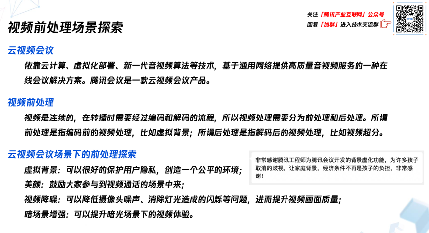 在视频通话中,视频前处理模块可以有效提升用户参与实时视频时的体验,并保护用户隐私,主要包括虚拟背景、美颜和视频降噪等。腾讯会议在视频前处理场景下,遇到哪些技术难点,如何进行优化?【腾讯技术开放日 · 云视频会议专场】中,腾讯云高级工程师李峰从算法和工程优化的角度进行了分享。