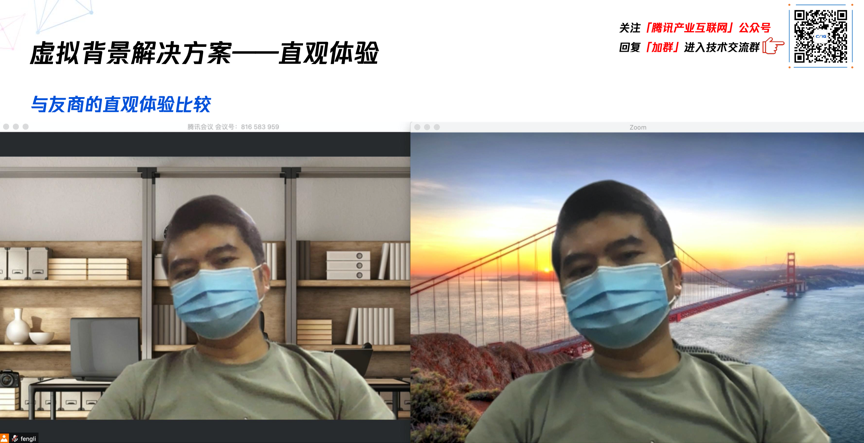 看一下跟友商的虚拟背景效果的直观体验对比视频,在某些场景下腾讯会议的体验要稍好一些,比如抬手的场景,腾讯会议要分割的更准确,左边是腾讯会议。