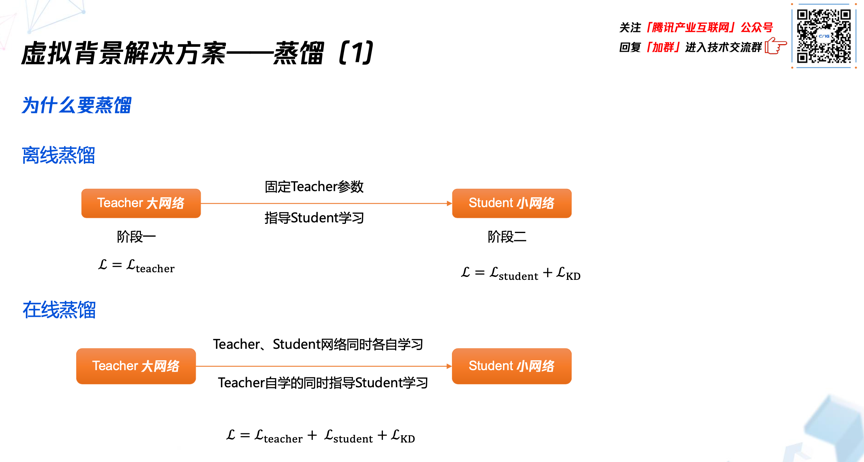 目前腾讯会议支持离线蒸馏和在线蒸馏两种方式。其中离线蒸馏是单独训练老师网络,然后固定老师网络的参数,通过老师网络指导学生网络进行学习。在线蒸馏是教师网络带着学生网络一起学习,这样对网络而言既包括了教师网络的自我学习,还有同步指导学生模型的蒸馏学习,也包括学生网络的自我学习。