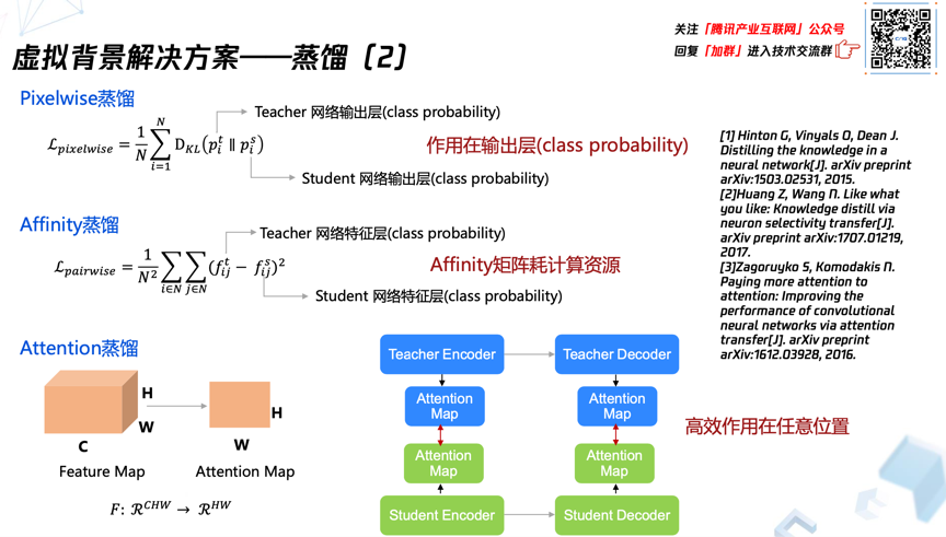 - 腾讯会议目前采用的是第三种,注意力蒸馏的方式,它是一种高效的约束中间特征层的蒸馏方法。从图中可以看出,经过建模空间注意力特征图从三维直接降到了二维,之后再进行约束,这样可以大幅降低计算量,提升蒸馏的效率。