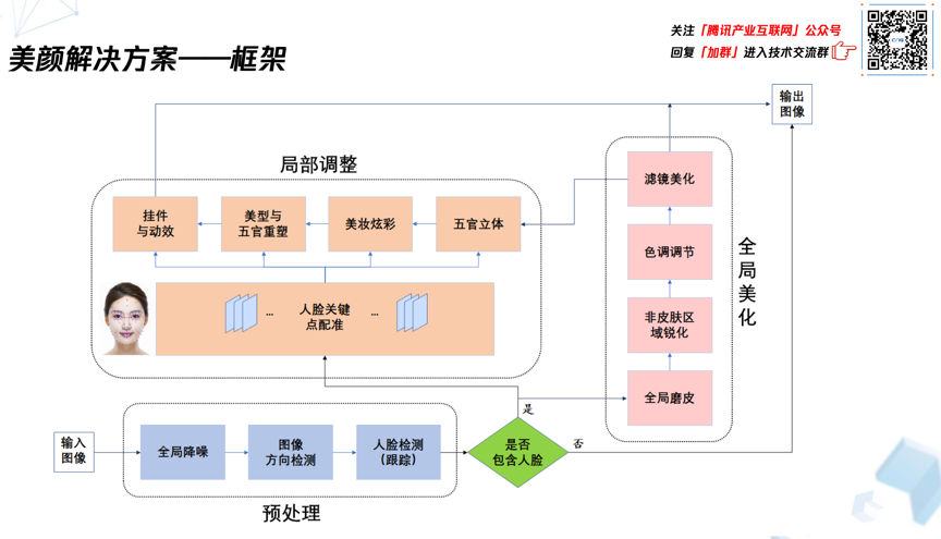 看一下美颜整体解决方案的框架,它包括三个部分:预处理模块、全局美化模块、局部调整模块。输入图像首先进入预处理模块,通过全局降噪图像处理提升图像质量,在实际应用中如果检测到人脸就可以进行全局美化或者局部美化,否则就直接输出降噪后的图像。全局美化模块实现图片整体美化效果,比如全局磨皮、非皮肤区域的润化色调调节,经过全局美化后的图片是可以具备比较好的整体视觉,是可以直接输出的。当然,也可以进一步进行局部调整,在这里是基于人脸关键点配准设计的一套算法,主要是实现五官立体、化妆等局部内容调整,最后是将调整后的图片输出。