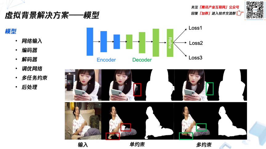 腾讯会议目前采用了经典的编码、解码、refine的结构。编码器会不断地降低分辨率并逐级抽象,而解码模块则是对多级特征进行融合学习,实现分辨率回升。同时腾讯会议还采用了多任务约束,下面的图中可以看到实验结果,经过多损失约束限制,输出的图会更加准确,边缘的一致性也得到了提升。
