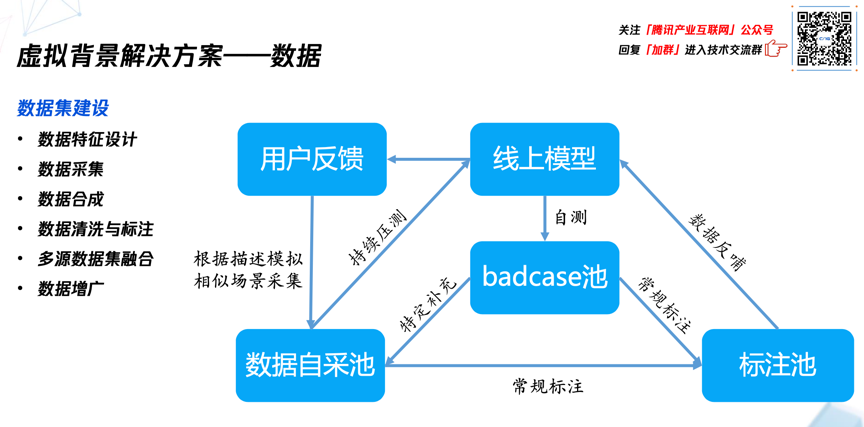 数据流程闭环是怎么形成的?具体来讲,首先是建立一个自采池,存放自采的数据。需要注意的是,由于用户数据的敏感性,腾讯会议拿不到任何线上实际的数据,所以只能模拟线上会议的场景来进行采集,比如大家一起进行自采,如果说这时候有用户反馈的话,会根据用户反馈的文字或者图片、或者视频的描述,来增加模拟布置类似的场景进行采集补充。