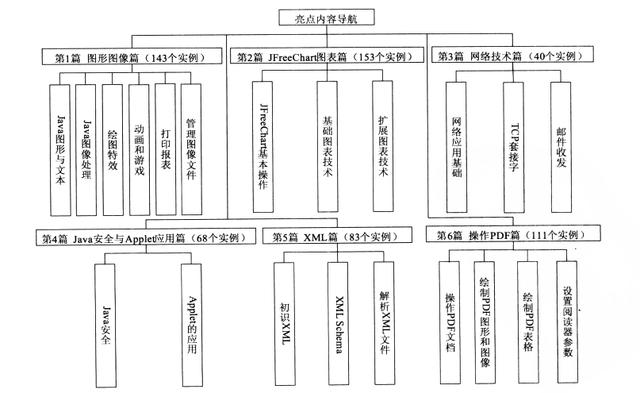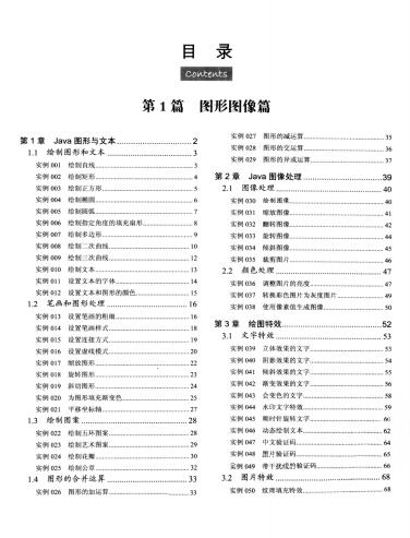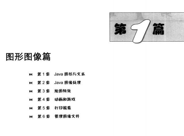 图形图像篇,共分为6章:Java图形与文本,Java图像处理,绘图特效,动画和游戏,打印报表,管理图像文件
