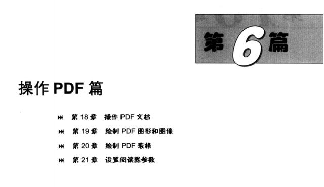 操作PDF篇,共分为4章:操作PDF文档,绘制PDF图形和图像,绘制PDF表格,设置阅读器参数