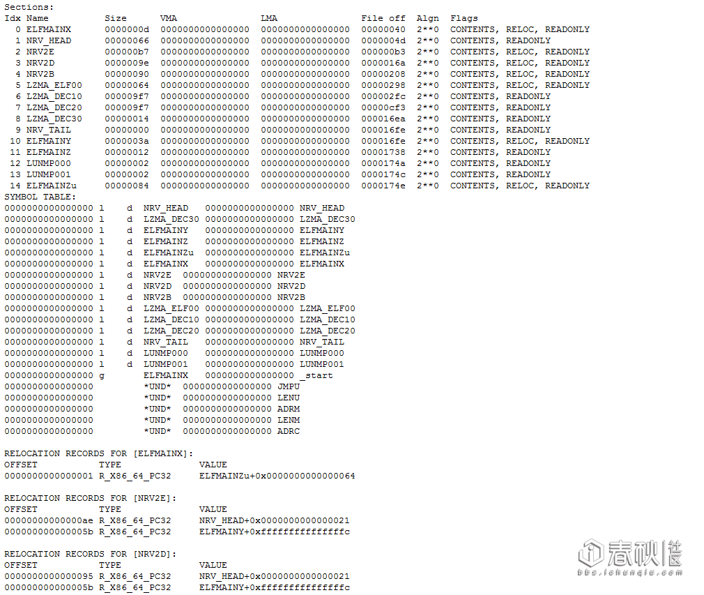 除了call指令的地址需要重定位外,其余的opcode都是一致的。对之后的内容进行验证,发现在这个可执行文件的loader中存在ELFMAINX, NRV_HEAD, NRV2E, NRV_TAIL/ELFMAINY…ELFMAINZ, LUNMP000, ELFMAINZu几个段,其中在ELFMAINY和ELFMAINZ中插入了其他指令。