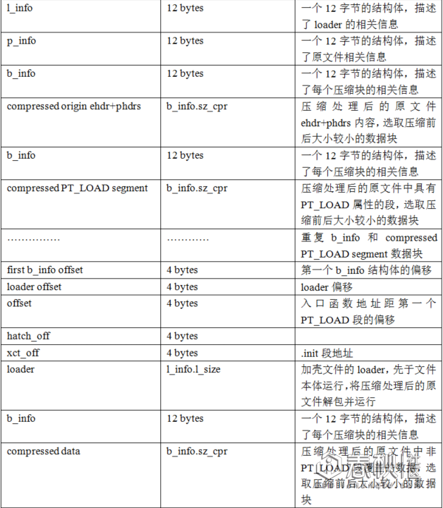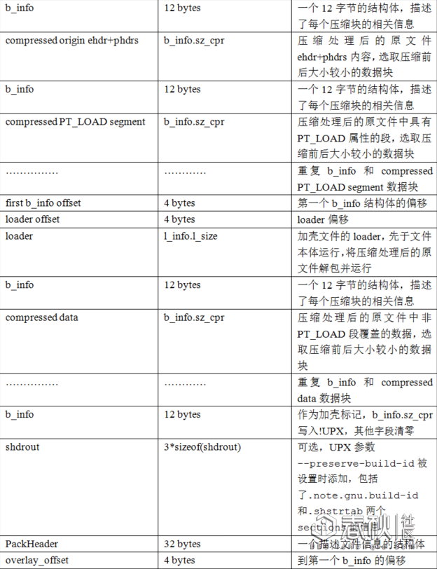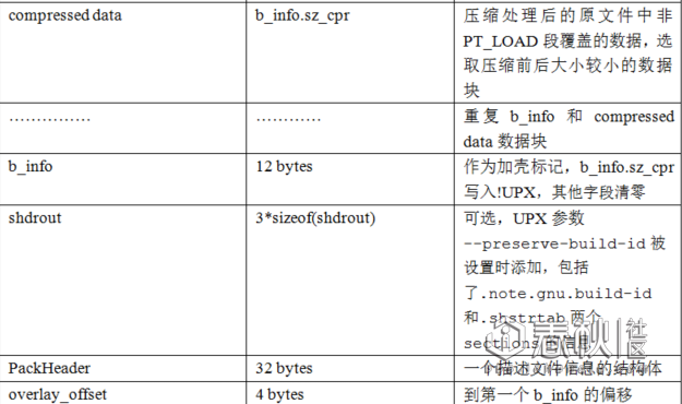 通过对加壳部分源码的分析,我们可以整理出一份Linux ELF通用的UPX加壳文件格式,分为可执行文件和共享库总结如下:
