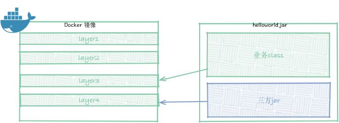 通过上文大家就可以知道分层 jar 的思想就是把,jar 再根据规则细分,业务 class 和 三方 jar 分别对应镜像的不同层,这样改动业务代码,只需变动很少的内容 提高构建速度。